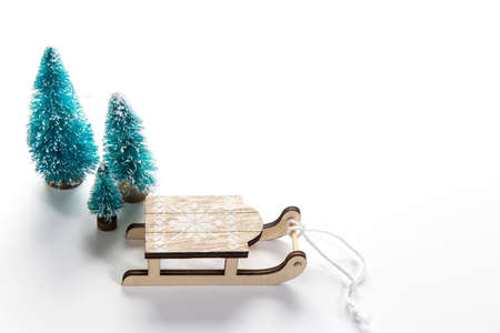 Wooden sleigh with decorative Christmas fir tree on white background. Christmas holidays. Copyspace. Place for text. Card