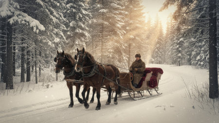 A horse-drawn sleigh travels through a snowy forest under bright daytime light. The image features a pair of horses pulling a sleigh with a passenger. The scene exhibits a winter landscape with snow-covered trees and a path. This image is suitable for various commercial uses, including advertising and editorial content.