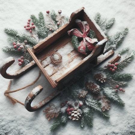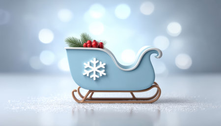 Blue sleigh decorated with pine branches red berries and snowflake ornament evokes cozy christmas wonder and festive winter holiday atmosphere