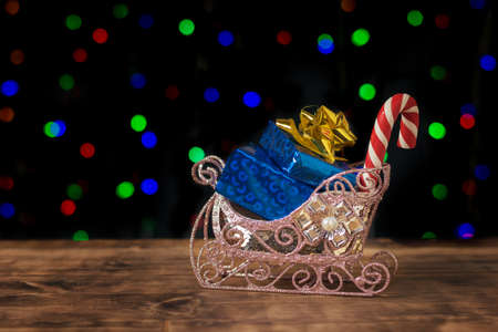 Decorative sleigh with blue gift boxes on a bokeh background. Meeting of Christmas and new year. Space for text.