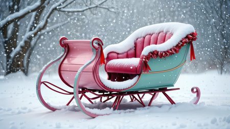 Santa's Whimsical Sleigh. A charming and colorful sleigh rests in a snowy winter wonderland landscape while snowflakes fall gently.