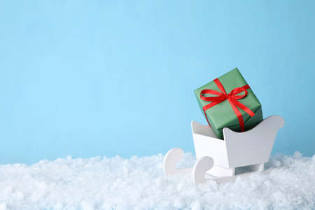 White wooden sleigh with Christmas gift box and artificial snow on light blue background, space for text