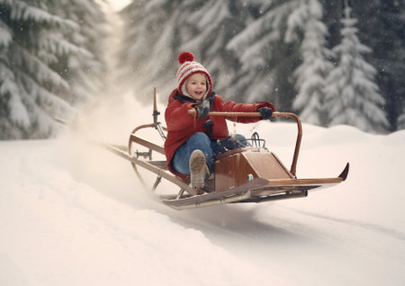 A family of three children are riding a sled down a snowy road. The children are wearing winter clothing and are enjoying the ride. The scene is peaceful and joyful, with the children laughing