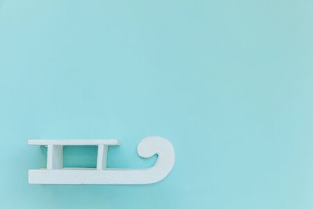 Simply minimal design composition white sled isolated on blue pastel colorful trendy background. Christmas New Year december time for celebration concept. Flat lay top view copy space
