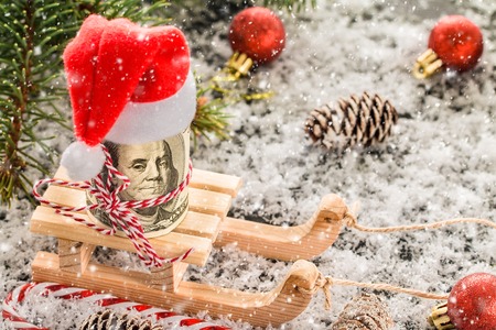 Money Christmas Gift with wooden sled. Christmas and New Year concept. Winter holiday composition. Christmas still life.