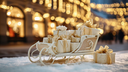 A beautifully crafted white sleigh filled with elegant presents glistens in a snowy market.