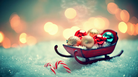 Santas sleigh with red Christmas ball, candy cane, snowflakes, set against festive winter backdrop.