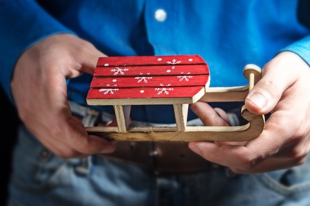 Toy wooden sled and with the hands of a young man.Christmas card. Christmas concept.