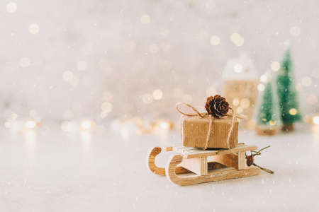 Eco Natural Christmas gift on toy wooden sled on white background with glowing light bokeh, copy space. New year card. Xmas decoration with house, Christmas tree and snow