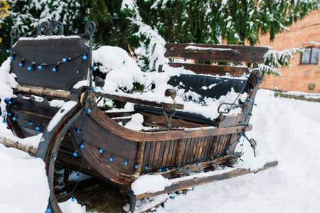 Santa Claus sleigh covered with snow in winter park. Christmas background