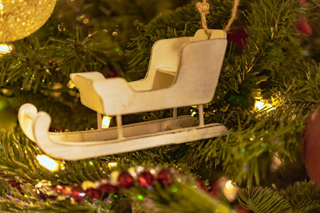 christmas decoration on fir tree branch closeup, wooden sledge toy, gifts, xmas ball, cone and other object on white blank space fur, holiday concept, place for text