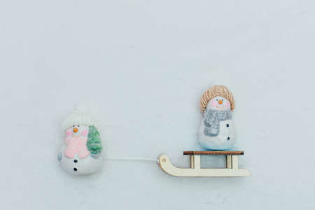 Decorative Christmas-themed figurines. Two statuette of a snowmen in a knitted hat on the sledge. Festive decor, warm bokeh lights