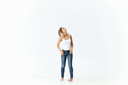 woman in jeans barefoot stands on the floor fashion emotions motion
