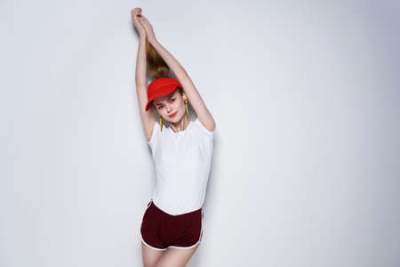 Young beautiful woman on a light background, diet, growing thin, progress.