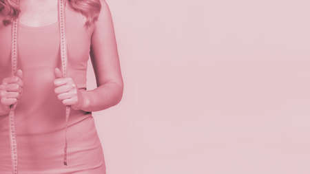 part of Fit woman in sportswear posing with measuring tape on background, monochrome image with pink tint