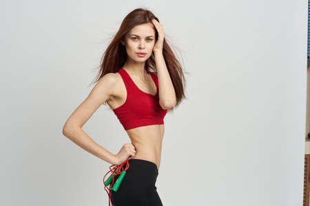 Girl with perfect waist with a jump rope in hands. Athletic slim woman measuring her waist by measure tape after diet. Fit fitness girl measuring her waistline with measure tape. Black and white