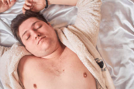 Young man sleeping in bed with pillows at home. Handsome man in bed. sleeper. Wake up Sleepy.