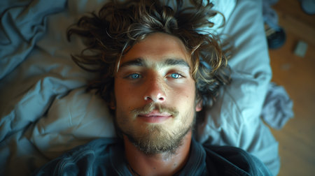 AI Generated. Serene Young Man Relaxing in Cozy Bed Surrounded by Soft Pillows