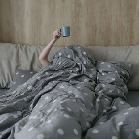 morning, coziness, cozy home concept - a hand with cup of coffee or tea in bed at home