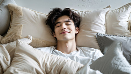 A young man sleeps soundly on a comfortable bed surrounded by soft pillows in a serene, inviting space.
