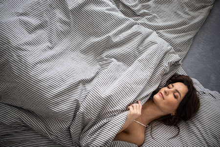 Top view of an attractive, young, sexy brunette woman, fanning hair wild around the face, sleeps, enjoys the fresh soft bed, copy space