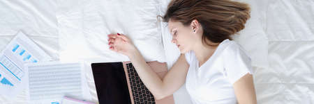 Woman sleeping in bed with laptop and documents top view