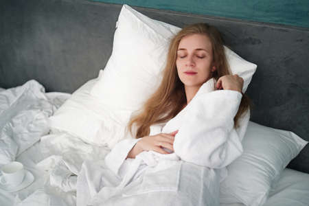 Young beautiful girl is resting in the hotel room in the morning, sleeping. Positive good mood, restoration of health, renewal of the nervous system. Long hair is down. Cute face with natural makeup.