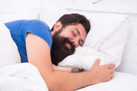 Sleeping handsome. Bearded man sleeping face relaxing on pillow. Handsome and sleepy. Sexy man sleeping in bed. Guy lying in bed try to relax and fall sleep. Enjoying beautiful morning