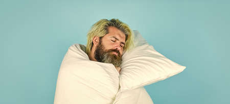 Melatonin makes you feel drowsy and helps you stay asleep. Fall asleep on go. Man handsome guy with pillow and duvet. Enough amount sleep. Tips sleeping better. Bearded man sleeping face relaxing
