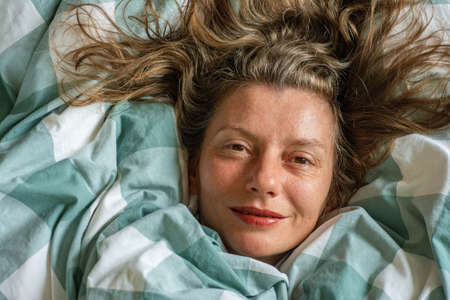 happy relaxed woman portrait sleeping in duvet. girl lies in bed top view