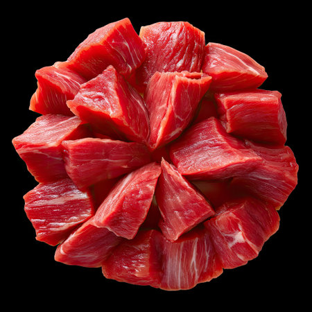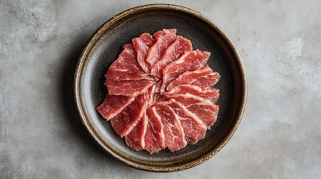 A fresh raw sliced beef arranged in circular pattern, showcasing vibrant red color and marbling, perfect for culinary presentations or gourmet dishes