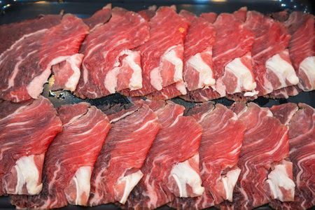 Raw freshly thin beef for hot pot and Japanese sukiyaki. Close up