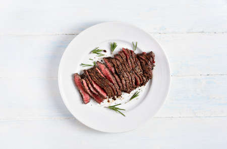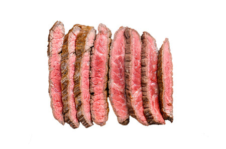 Grilled and sliced Flank rare steak. Marble beef meat. Isolated on white background. Top view