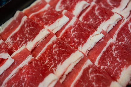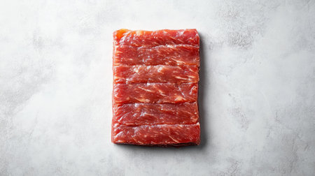 A fresh raw beef slices arranged in neat layers, showcasing vibrant red color and delicate marbling, perfect for culinary presentations or gourmet dishes