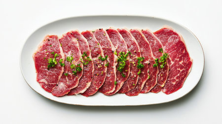 This image features neatly arranged raw beef slices on a white background. Ideal for culinary presentations, recipes, and food styling. Perfect for use in food-related projects.