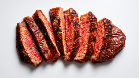 A beautiful presentation of grilled steak slices showcasing juicy pink meat and a perfectly seared crust. Ideal for culinary projects, gourmet menus, and food photography.