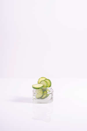 cucumber based cosmetics. Rings of sliced cucumber in a glass container. on white background minimalism