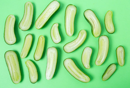 Cut cucumbers on green paper. Top view.