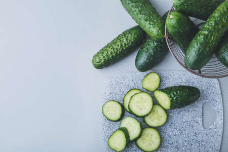 Fresh cucumbers and cucumber slices on grey top view