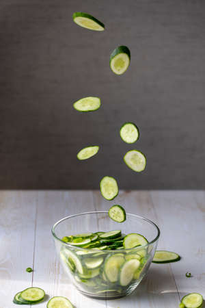 Cooking salad with fresh cucumbers. Flying slices of cucumbers in a glass plate for salad on the background of canned cucumber salad in glass jars.