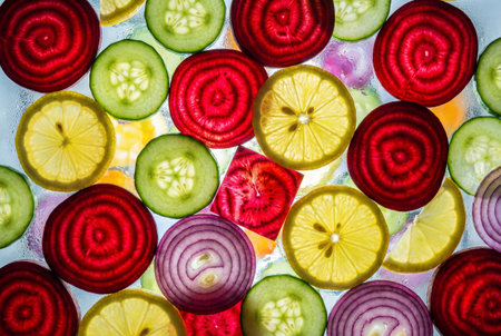 Vibrant backlit composition of thin red beetroot, yellow lemon, green cucumber, and purple onion slices arranged to display their internal textures and colors against a bright light.