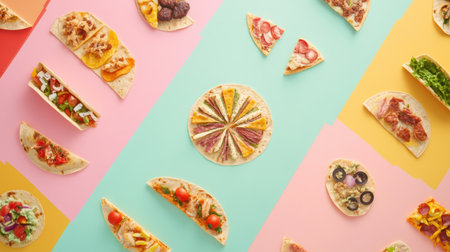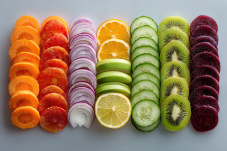 Colorful display of sliced fruits and vegetables, featuring oranges, cucumbers, kiwis, and red onions, emphasizing healthy eating and vibrant colors with copy space