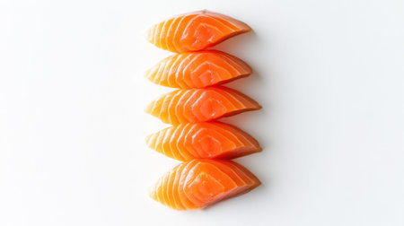 Vibrant, fresh salmon slices neatly arranged on a white surface showcase their rich color and inviting texture, perfect for culinary projects or recipes.