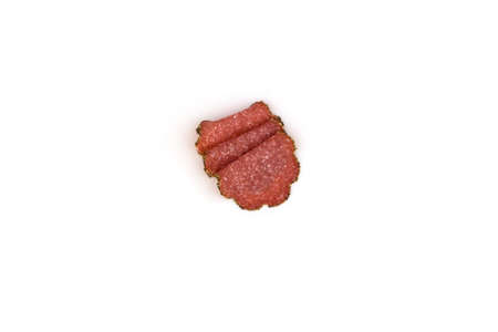 Slices of smoked brisket, fat bacon, dried chili pepper, pieces of bread on dark wooden table. Top view