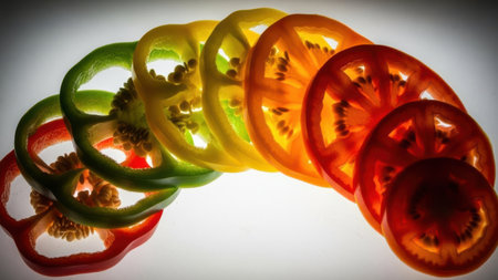 Translucent slices of red green yellow orange pepper and tomato forming spectrum shape against bright white background closeup.