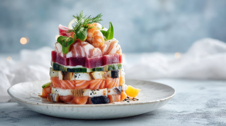 Brightly colored seafood stack featuring layers of shrimp and fish garnished with fresh vegetables and herbs, ideal for culinary presentations and gourmet recipes.