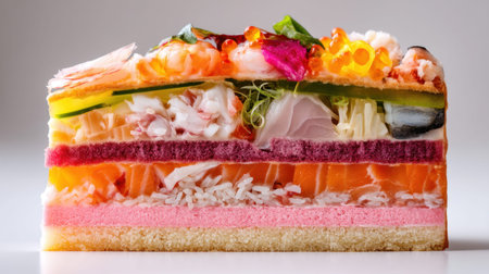 A stunning layered sushi cake showcasing a variety of fresh seafood, rice, and colorful toppings, perfect for special occasions and culinary presentations.
