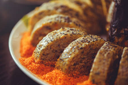 Stuffed pike garnished in a platter with sauce, restaurant food, homemade dish, Traditional Jewish food. close-up