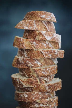 Stack of bread toast. Artisan bread. Close up. The bread of sourdough, homemade and natural creation. The sourdough has natural yeast, which makes the food healthier, as well as rich.