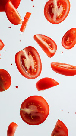 Fresh, vibrant red tomato slices levitating against a clean white background create a dynamic, appetizing visual, emphasizing juicy freshness and healthy appeal